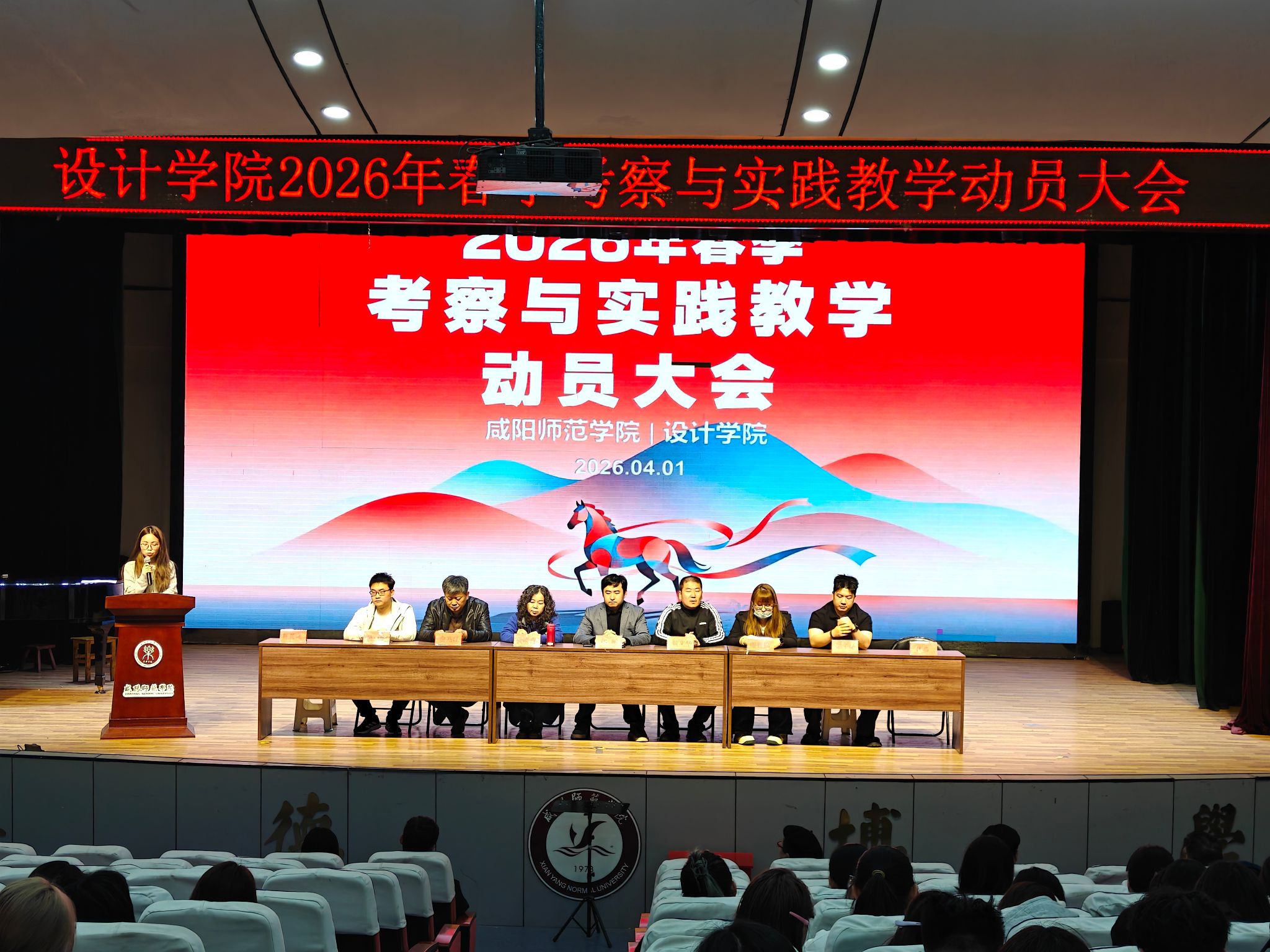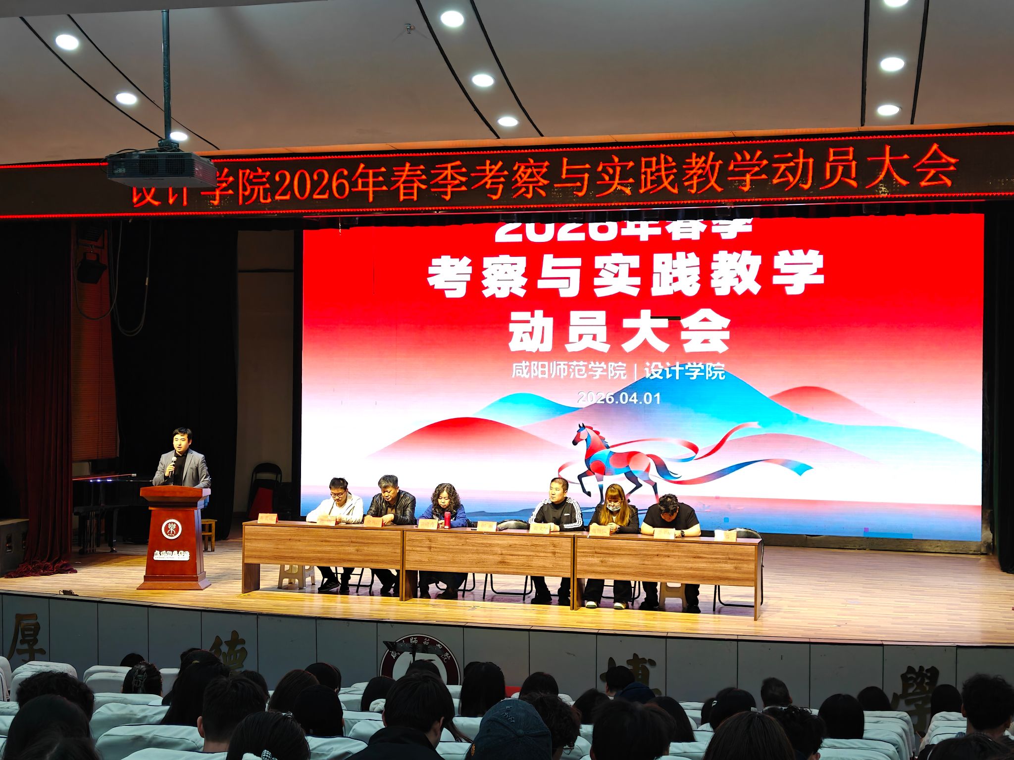 为进一步深化应用型设计人才培养模式改革,规范实践教学管理并做好外出师生的动员与安全教育工作,4月1日,设计学院在艺术楼一楼演播厅召开2026年春季2024、2025级《考察与实践》教学动员大会。设计学院副院长刘翔、教学工作负责人鄢琳、2024级辅导员靳晨曦、学院办公室主任、教学秘书、各线路领队及带队教师,以及2024级、2025级全体本科生共同参加了此次大会。