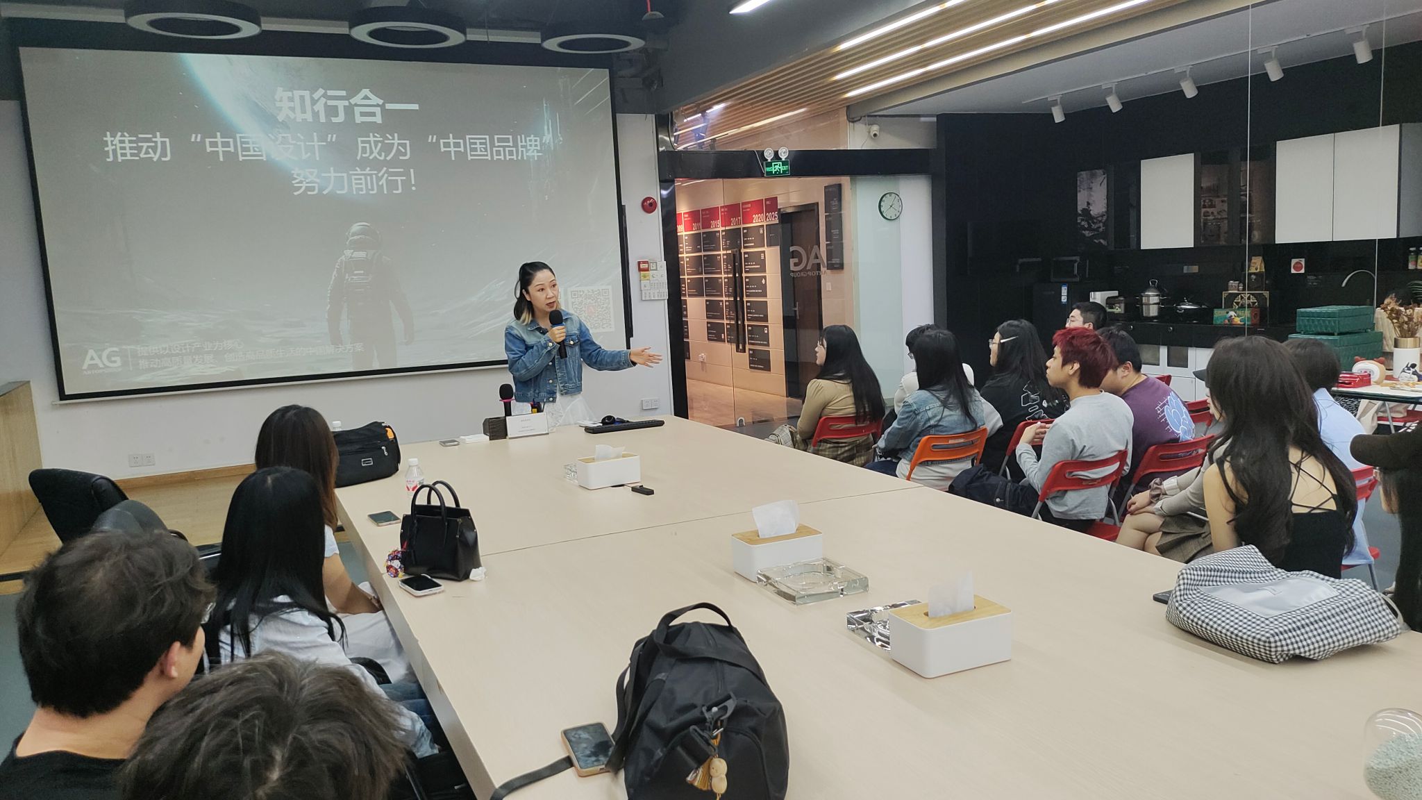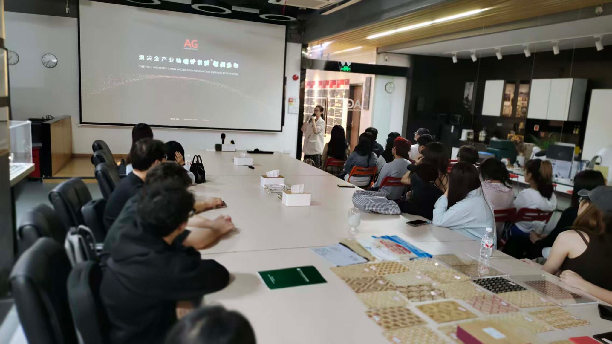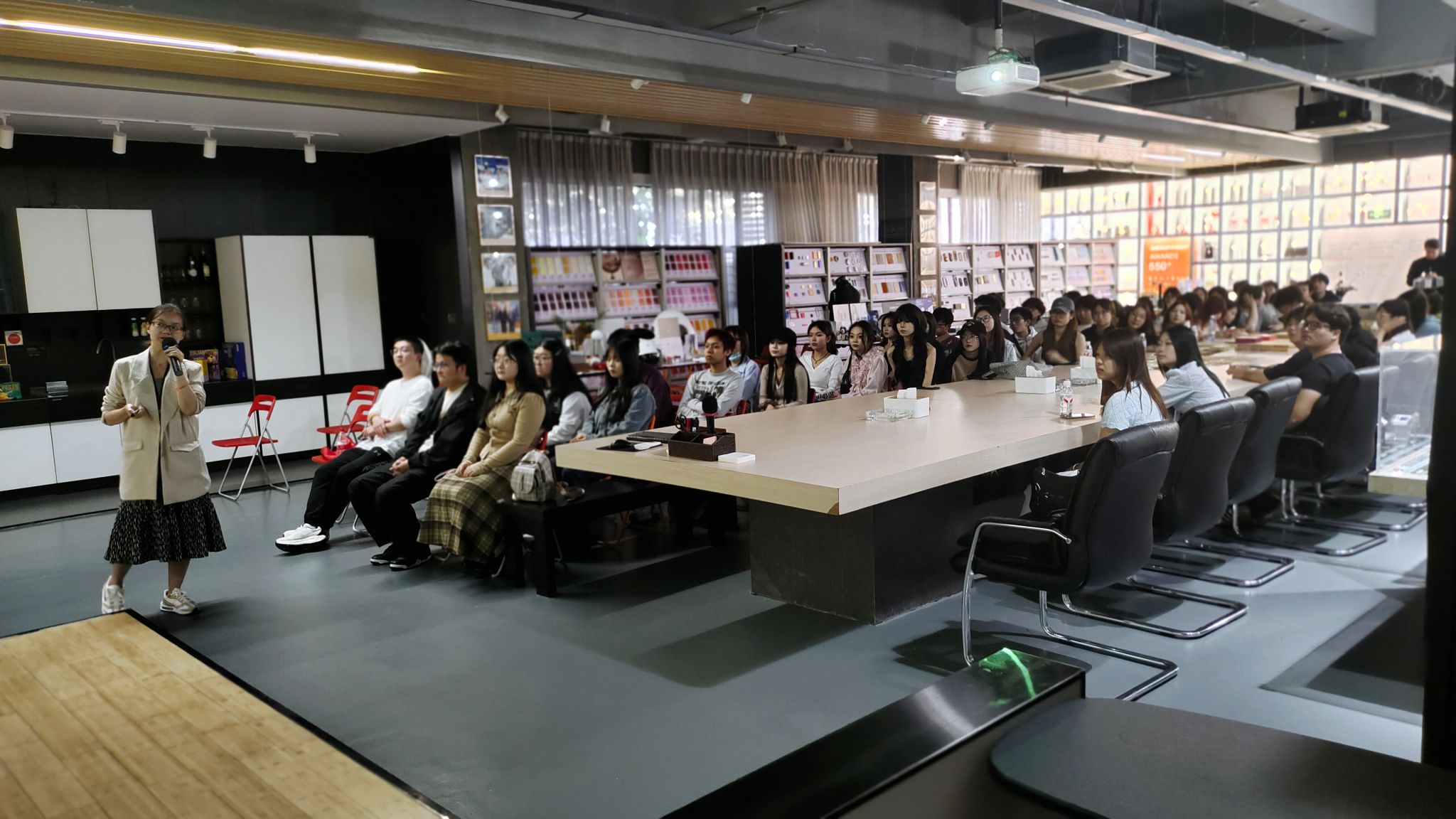 在浪尖设计集团总部,产品设计师生参观了设计展厅和工作室,深入了解设计项目的完整流程。资深设计师陈爽爽为师生们做了专题讲座,系统介绍了浪尖"全产业链设计创新服务生态"的运作模式,从产品创新、产业创新、社会创新三方面切入,详细介绍了产品策略设计、产品场景设计、外观造型设计、产品原型、CMF设计、PI规划设计、创意落地跟进、推广辅助设计等设计服务版块,分享了多个成功案例的设计思路和实施过程。