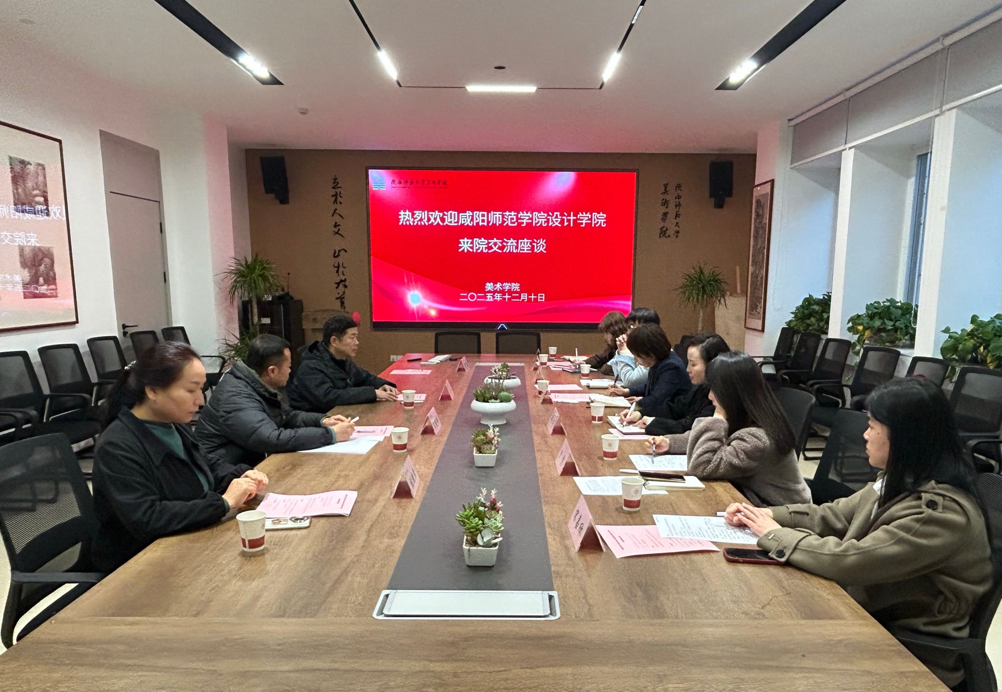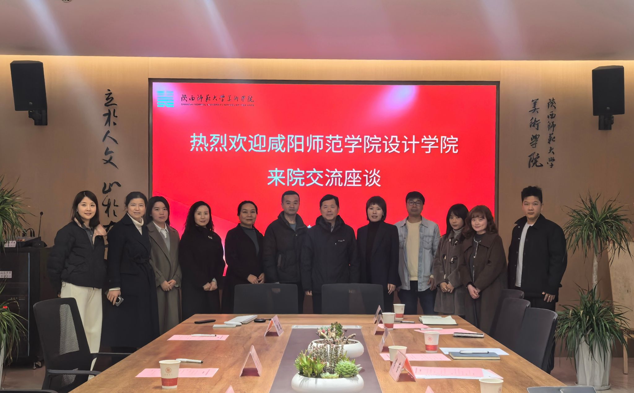 2025年12月10日,咸阳师范学院设计学院副院长李莹率骨干教师赴陕西师范大学美术学院开展调研座谈,会议由陕师大美术学院院长韦宾主持。双方围绕学科建设、人才培养、科研创新、实验室管理等核心议题深入交流,为咸阳师院设计学院发展精准赋能,助力设计学科高质量发展。